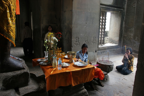 alten Tempel Angkor Wat. Sie kniet und sie lässt ihre Gebete mit Hilfe von